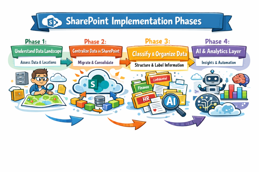 Many (many !) clients think a SharePoint project ends when the data is transferred (warts and all) from on-prem to M365 when in fact that is only part way through. If you want that data to become a knowledge source for future AI initiatives and agents it needs to be organised, structured and labelled.